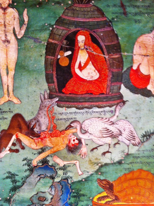 The experience of groundlessness, I was once told by a psychotherapist who happened to be Buddhist, was not something to be cultivated, but rather, an experience more grounded and tangible was deemed as more valuable, within the process of spiritual growth. I have come across a number of psychoanalysts who warn in their writings that unguided exploration and or cultivation of the experience of groundlessness can lead to a state of psychosis. These warnings are interesting. They are interesting in part because I often wonder about the utility of combining psychoanalysis with Buddhist practice, especially if one is going to fully embrace emptiness of self. In all likelihood the combination of both Buddhism and psychotherapy can be a very effective way with which one can effect a necessary change in one’s experience of life to reduce suffering. Yet I sometimes wonder how much we benefit from aligning our living and breathing practice of dharma with the structures of our intellect such as modalities that seek to measure and define our experience as we move along our path as found within the psychoanalytic model. Our intellect often arises in a manner that does not make sense; especially when the sense of self is threatened. Like sparks, or flashes of lightening in the night sky, the reverberation of the reactive ego- the sense of self-nature wrapped up with the demons that keep it preoccupied- obey no one person. They are messy, sometimes terrifying and often very powerful. Similarly, the fast arrival of vajrayogini with her retinue of dakinis arise in an unpredictable way; this is why they are so integral within this practice and this too is why chöd confounds approaches that seek to find a restorative refinement and distillation of the Self. After all, how can one distill that which is not there?