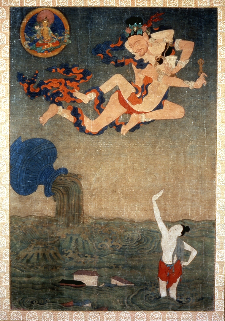 Therefore after reflecting for one whole week, he determined that by assuming a wrathful form he would be able “to subdue the degenerate beings of this Age of Darkness.” Also he saw that even beings who practiced Dharma were unable to escape from the Bardo realms (time between rebirths where beings may face great anxiety and terrifying experiences) and he thought that in wrathful form he could also protect them in that way. And lastly, he thought that the beings in this Dark Age were poor and needy, experiencing only suffering after suffering, and that in wrathful form he could provide them an antidote to that suffering so that by simply making the wish (for protection) their needs could be met.