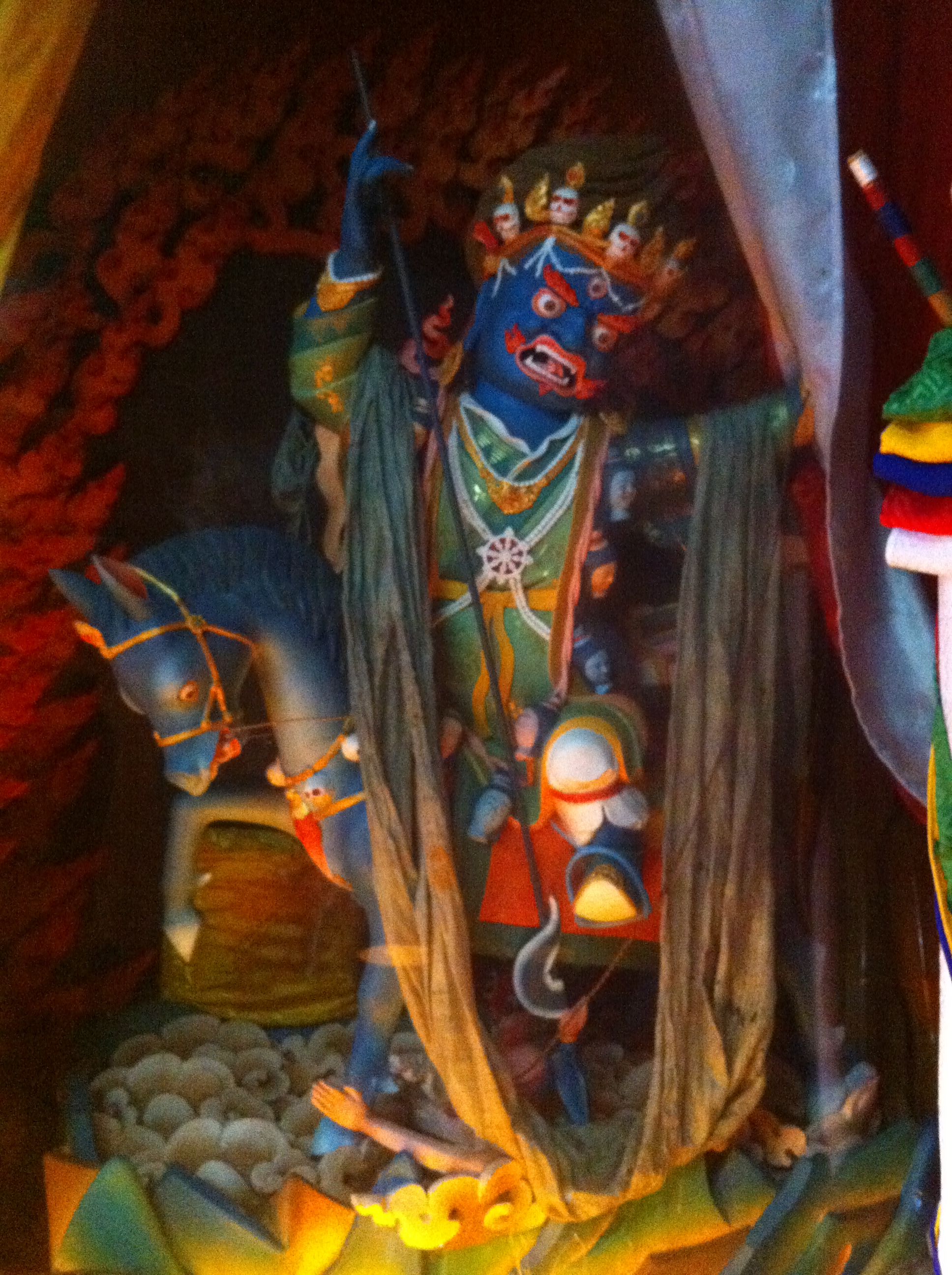 Lakes of blood, wild stallions, human hearts, flayed elephant and human skins, and ravens; Mahakala, the compassionate protector, is intense. I am reminded of the protector shrine at Rumtek monastery in Sikkim where the ceilings and walls are adorned with weapons and animal skins, the room is thick with an atmosphere of near viscous intensity. I have also spent time in the protector shrines of Ralung Monastery and Bokar Rinpoche’s monastery; each one has a similar feeling. They are seats of great power: pithas. When in a place like these special shrine rooms it seems that at any moment Trakshe, one of the protectors in Mahakala’s entourage, will swoop down riding his demonic horse. While he is oath-bound to protect us, he and the rest of Mahakala’s retinue is nevertheless terrifying in many ways.