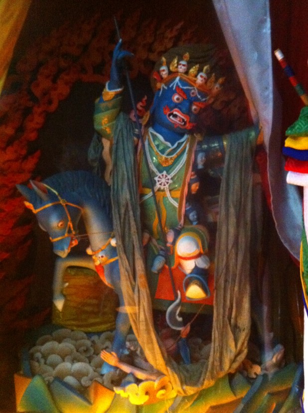 Lakes of blood, wild stallions, human hearts, flayed elephant and human skins, and ravens; Mahakala, the compassionate protector, is intense.  I am reminded of the protector shrine at Rumtek monastery in Sikkim where the ceilings and walls are adorned with weapons and animal skins, the room is thick with an atmosphere of  near viscous intensity.  I have also spent time in the protector shrines of Ralung Monastery and Bokar Rinpoche’s monastery; each one has a similar feeling.  They are seats of great power: pithas.  When in a place like these special shrine rooms it seems that at any moment Trakshe, one of the protectors in Mahakala’s entourage, will swoop down riding his demonic horse.  While he is oath-bound to protect us, he and the rest of Mahakala’s retinue is nevertheless terrifying in many ways.