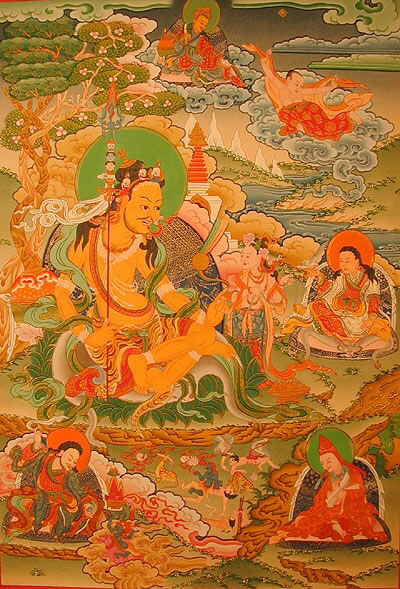 This final image is of Guru Rinpoche as himself, who among most Himalayan Buddhists is considered the second Buddha in the sense that he is credited with bringing Buddhism to Tibet. While he wasn’t technically the first, he was the first to introduce tantric Buddhism in a way that took hold, and is credited with helping to construct the first Buddhist monastery in Tibet. A dynamic teacher, Guru Rinpoche embodied all of the qualities of his eight manifestations and countless others. Through the expression of his life Guru Rinpoche was able to display pacification, enriching, magnetizing, and subjugation both in Oddiyana, India, Bhutan, Tibet, and even now.
